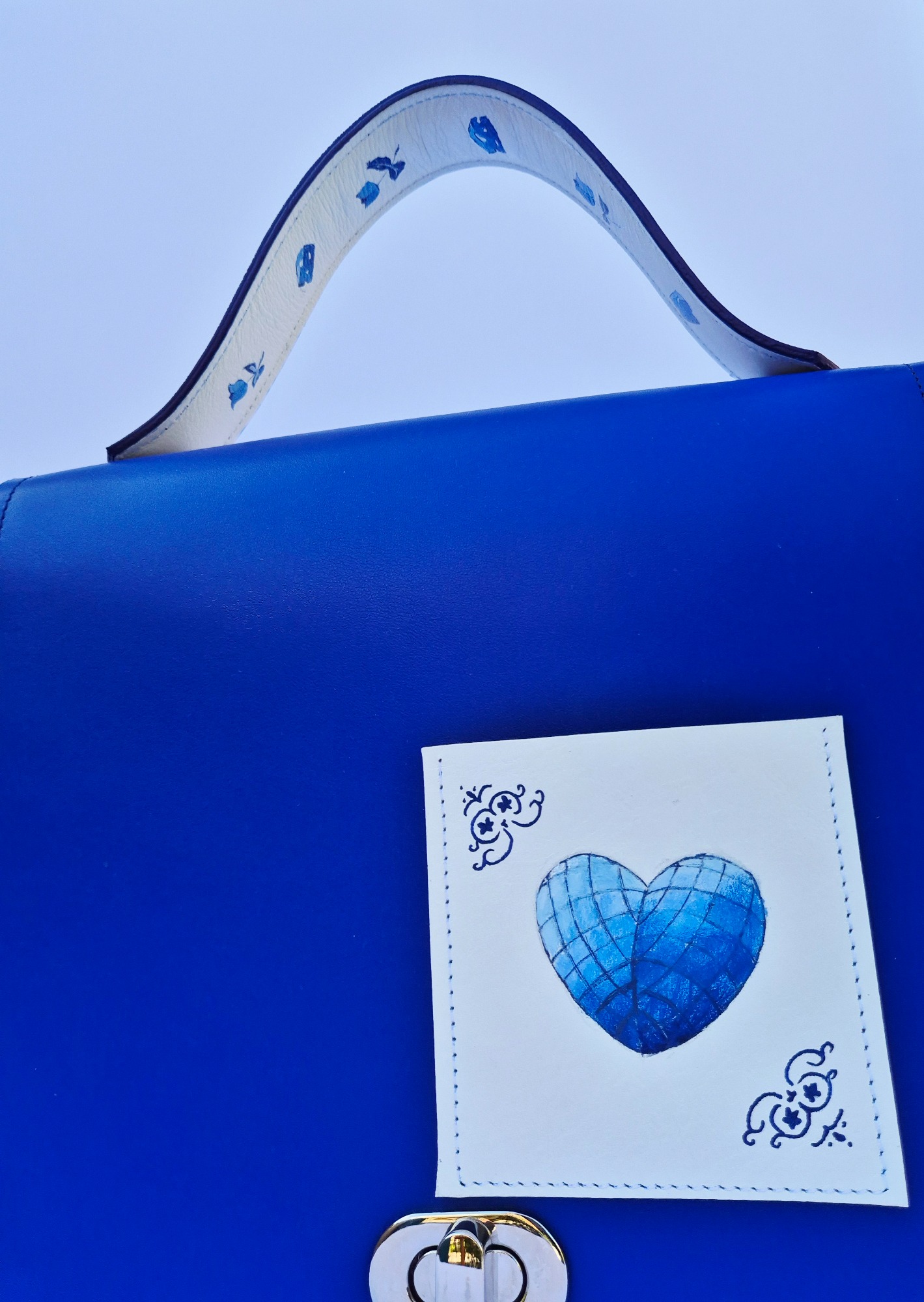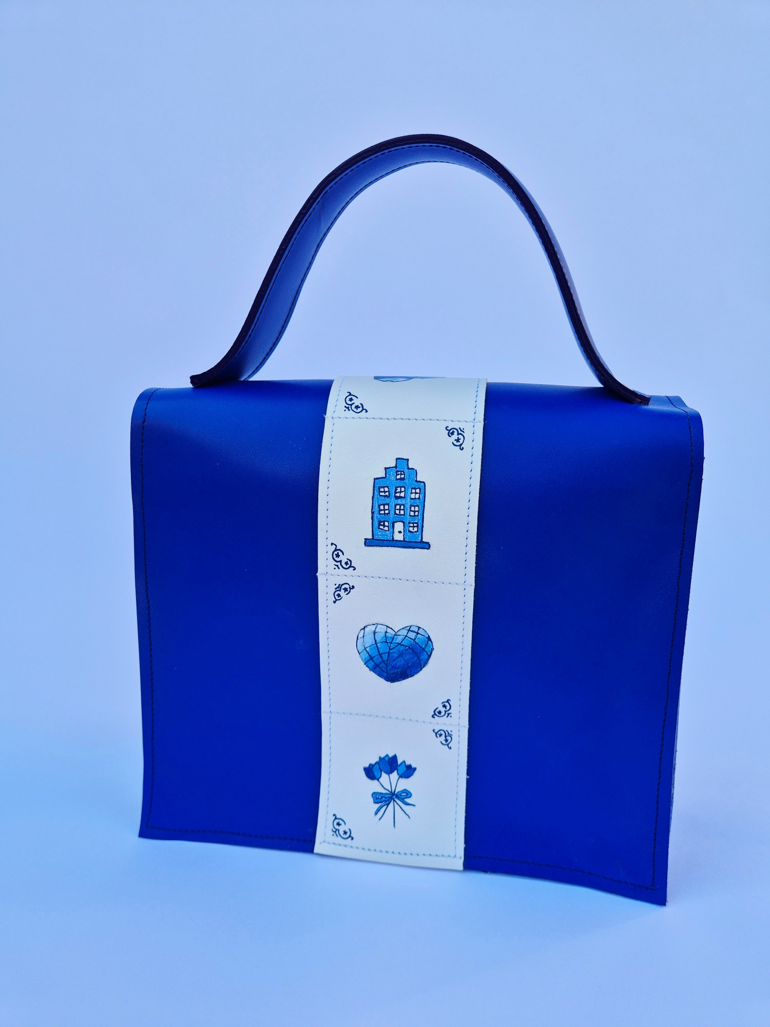 De handtekening van Croon Delft: luxe lederen tassen verrijkt met handgeverfde Delfts Blauwe tegels.