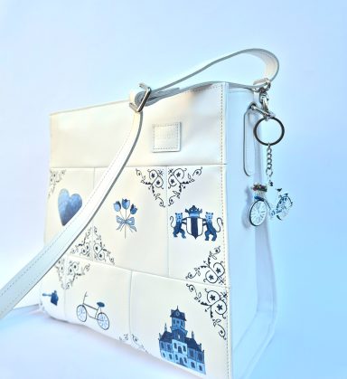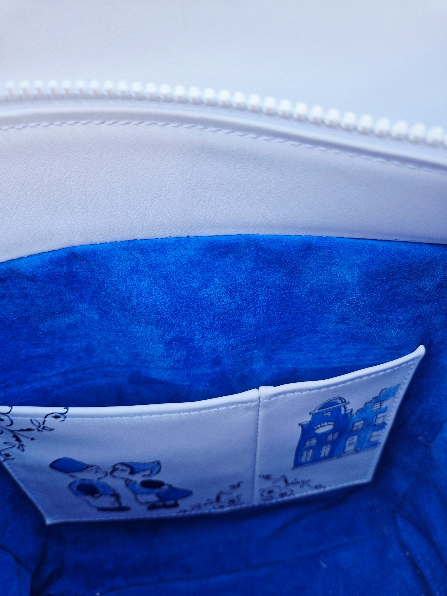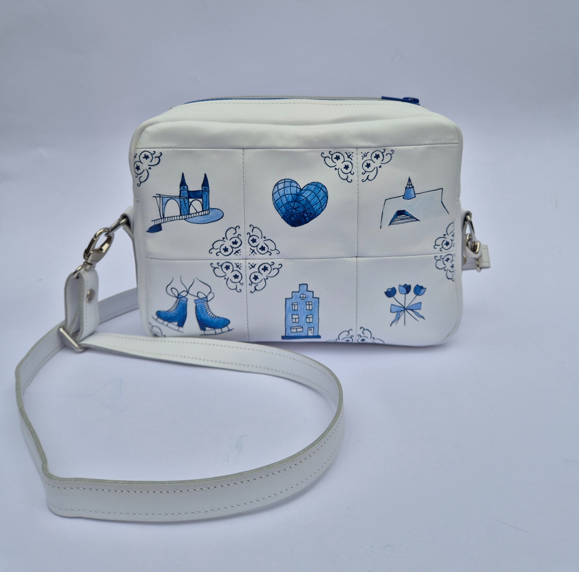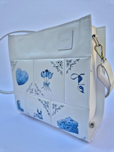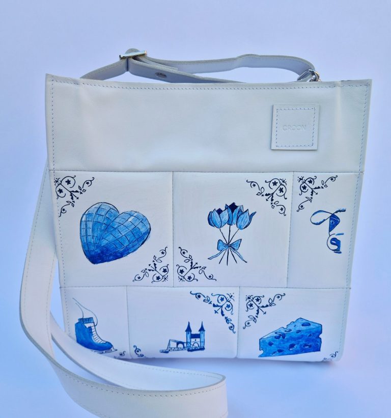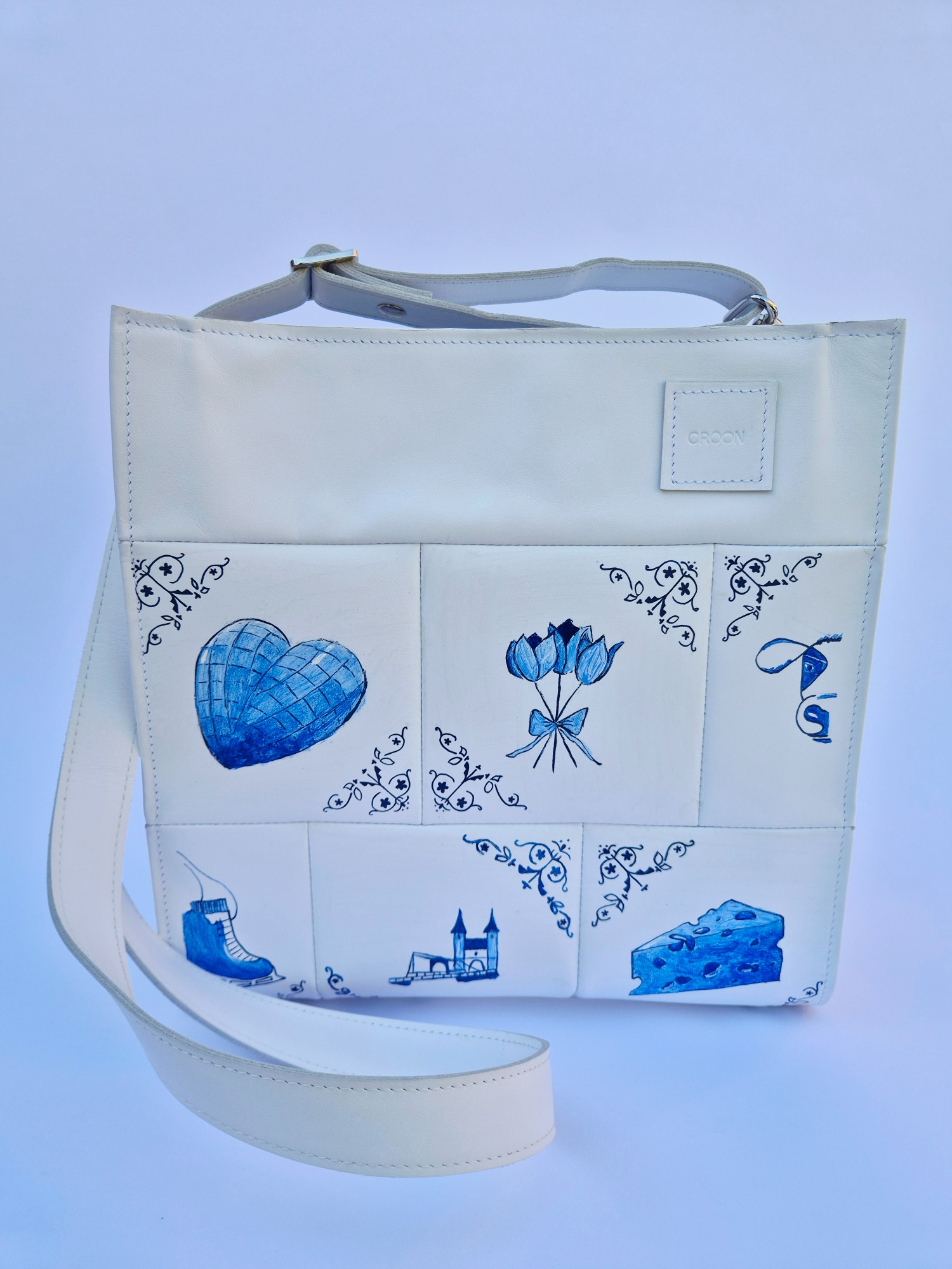 De kenmerkende ontwerpen van het label Croon Delft bestaan uit met de hand beschilderde Delfts Blauwe lederen tegels, die zorgvuldig in de tassen zijn verwerkt als opvallende pronkstukken.