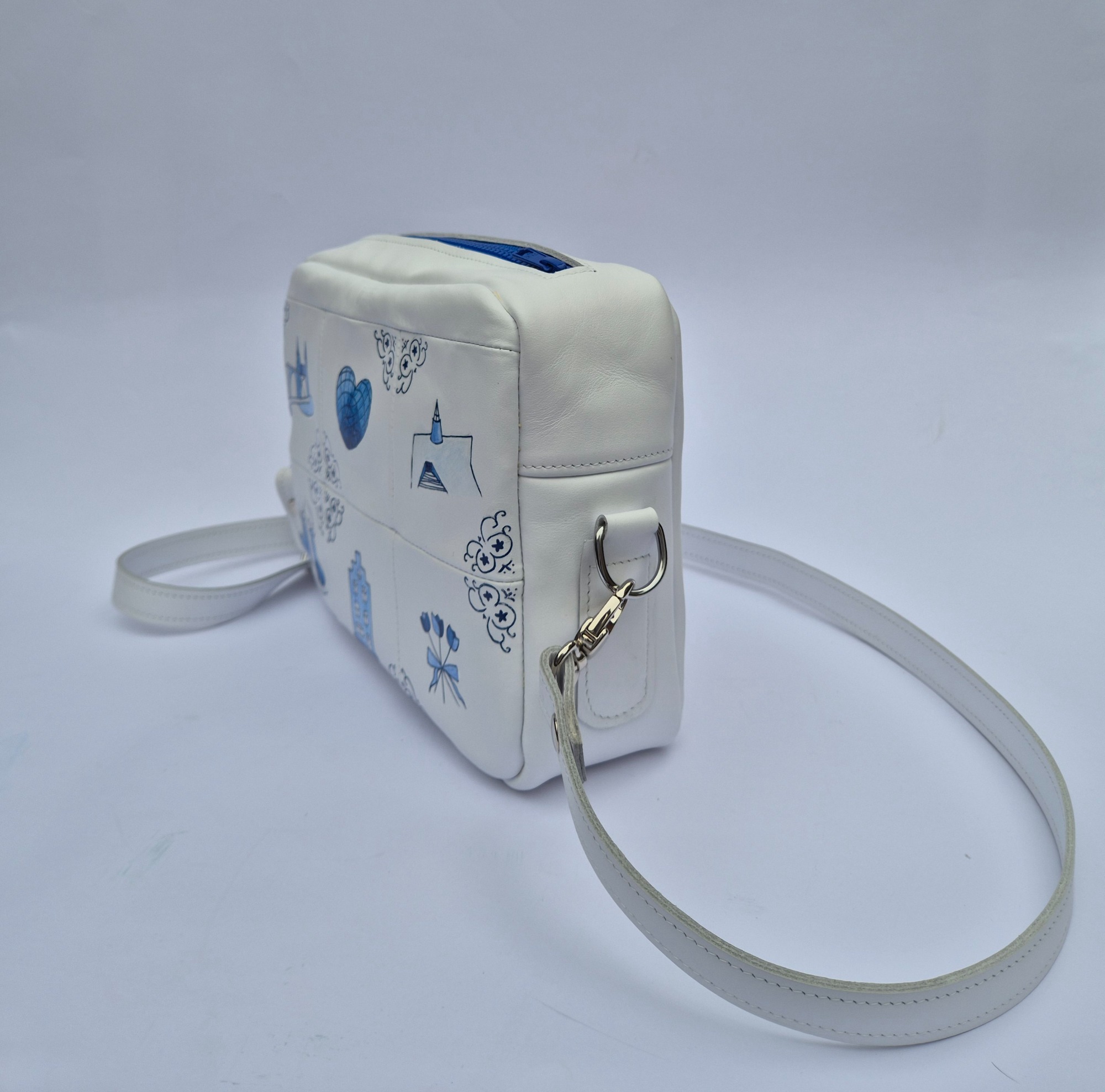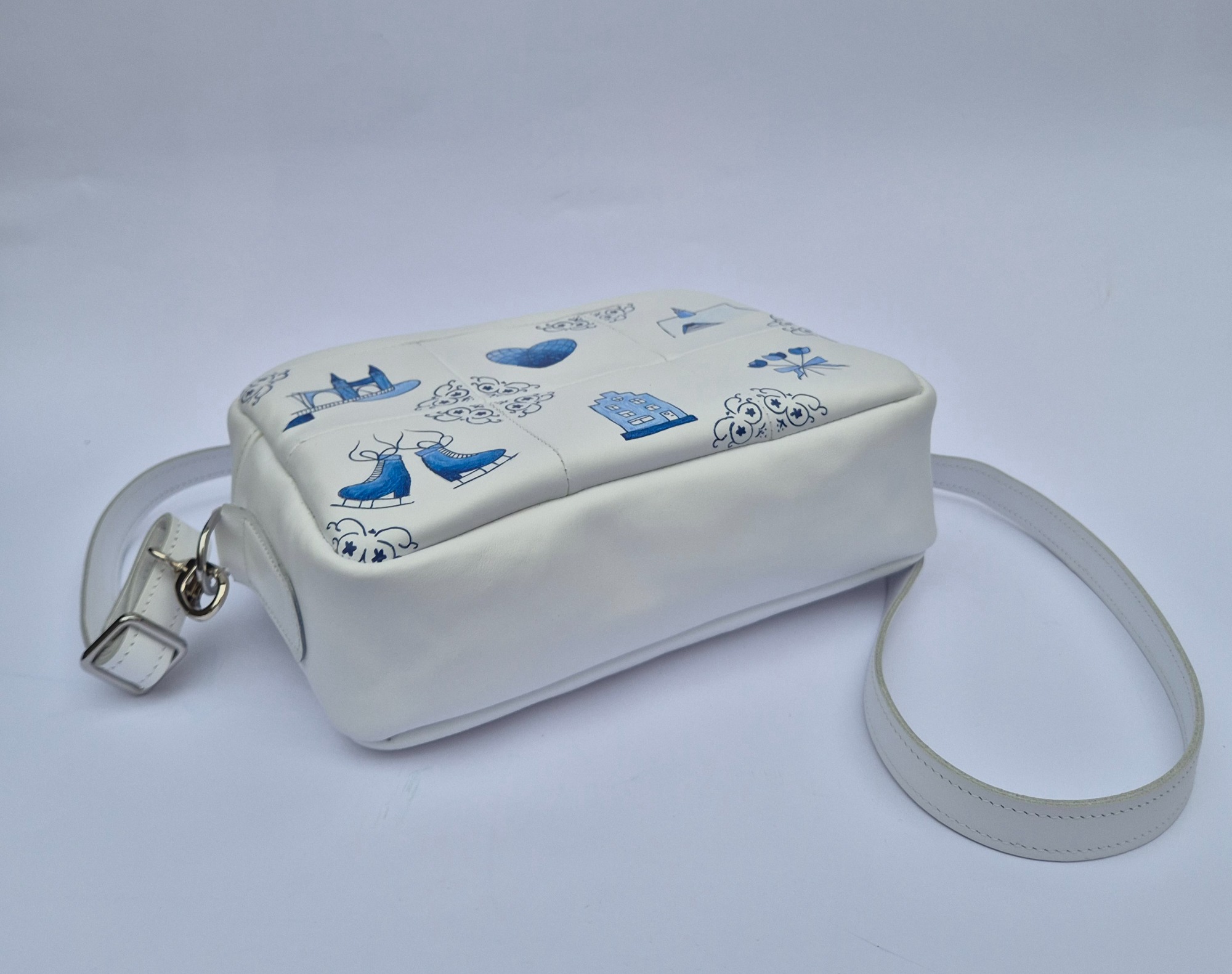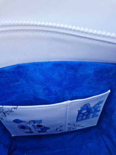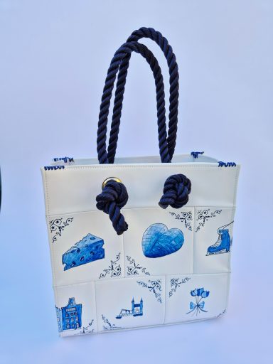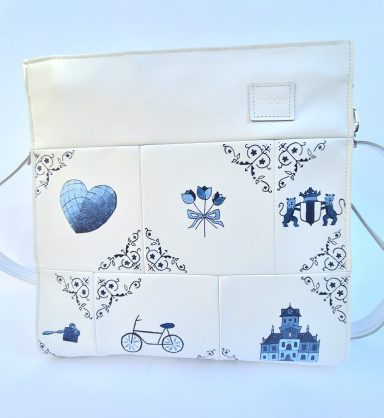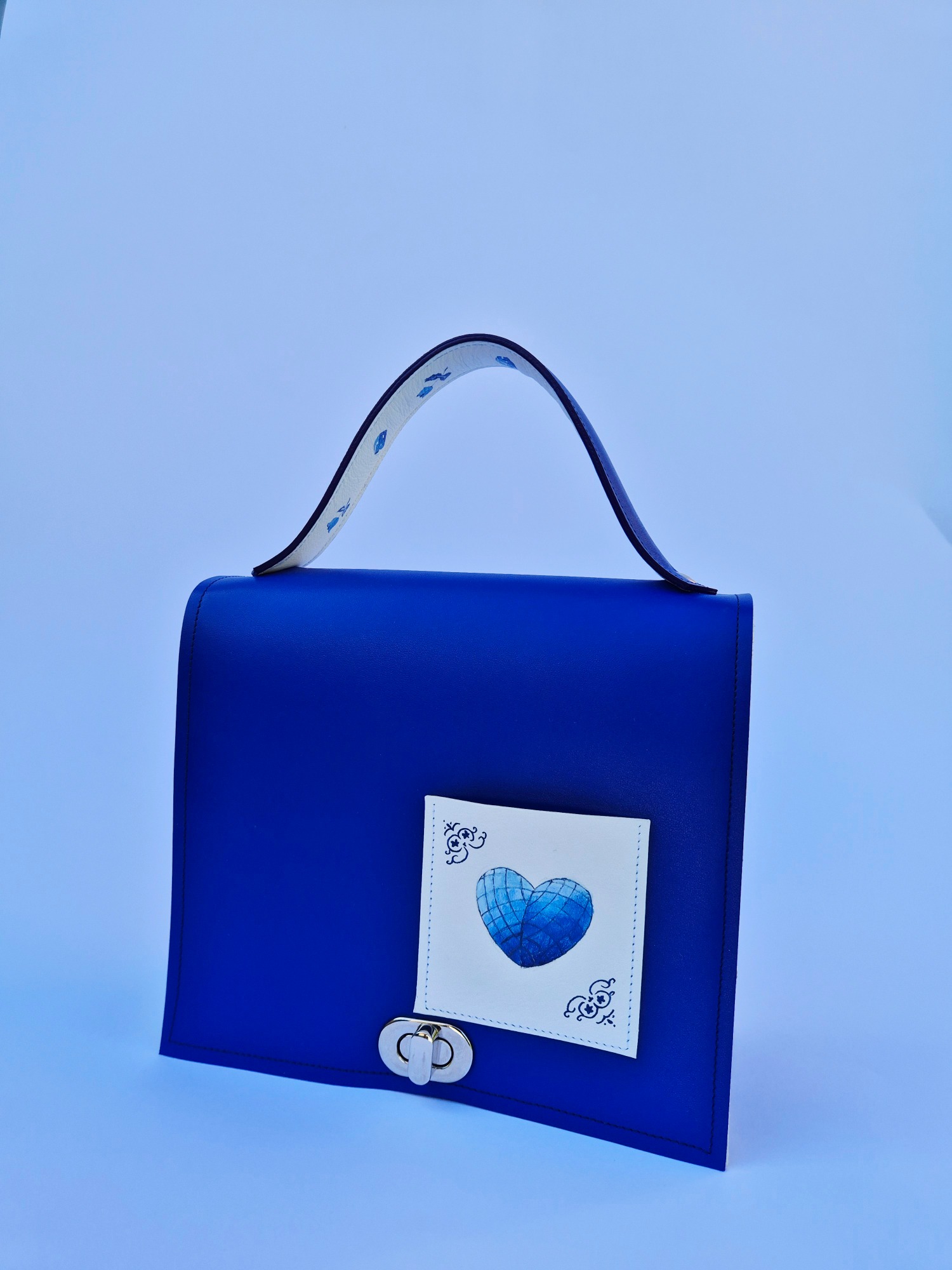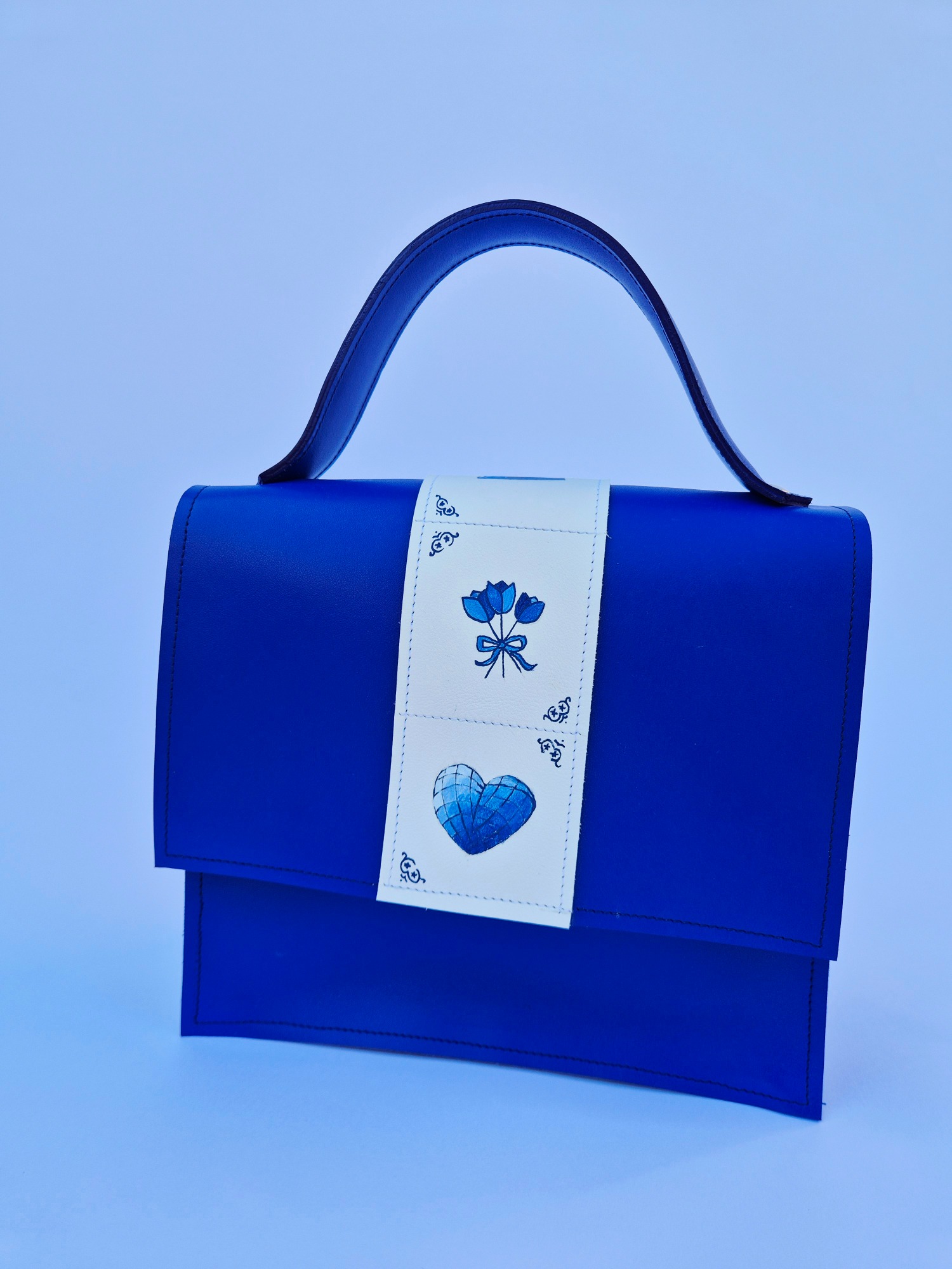 De kenmerkende ontwerpen van het label Croon Delft bestaan uit met de hand beschilderde Delfts Blauwe lederen tegels, die zorgvuldig in de tassen zijn verwerkt als opvallende pronkstukken.