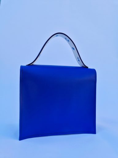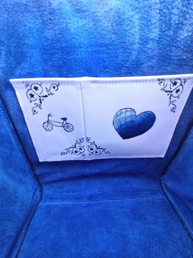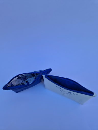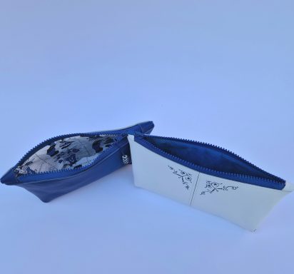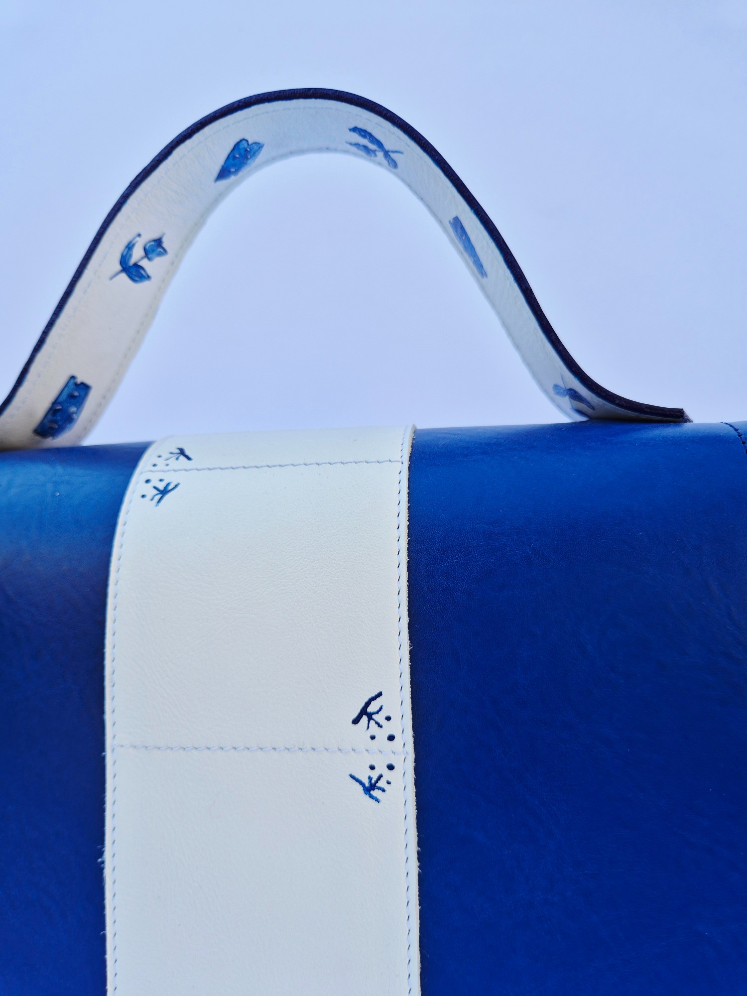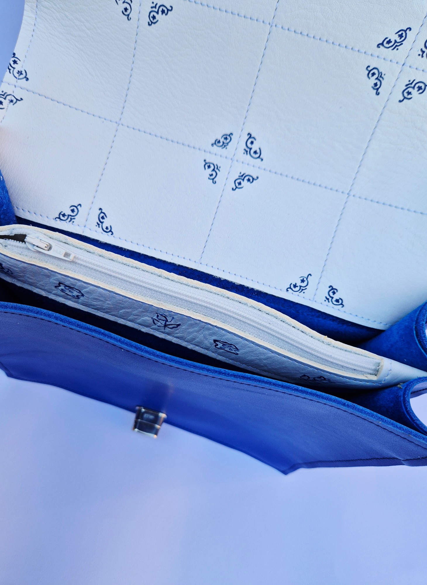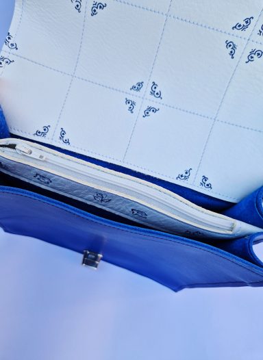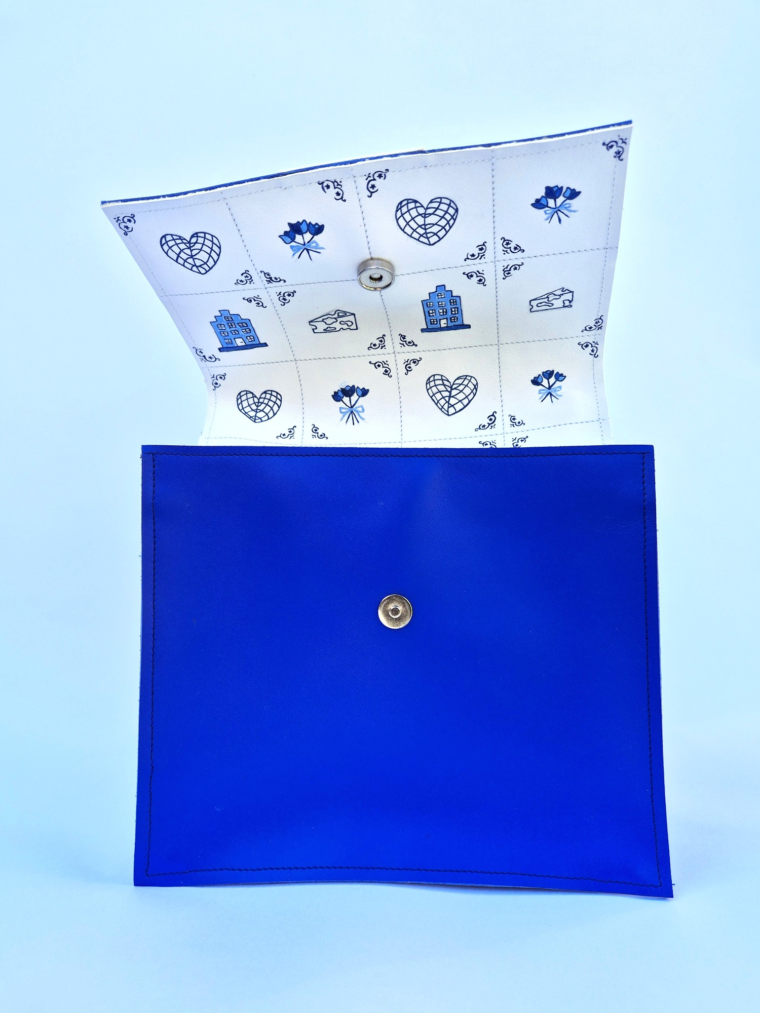 De kenmerkende ontwerpen van het label Croon Delft bestaan uit met de hand beschilderde Delfts Blauwe lederen tegels, die zorgvuldig in de tassen zijn verwerkt als opvallende pronkstukken.