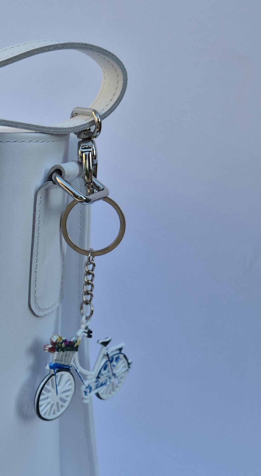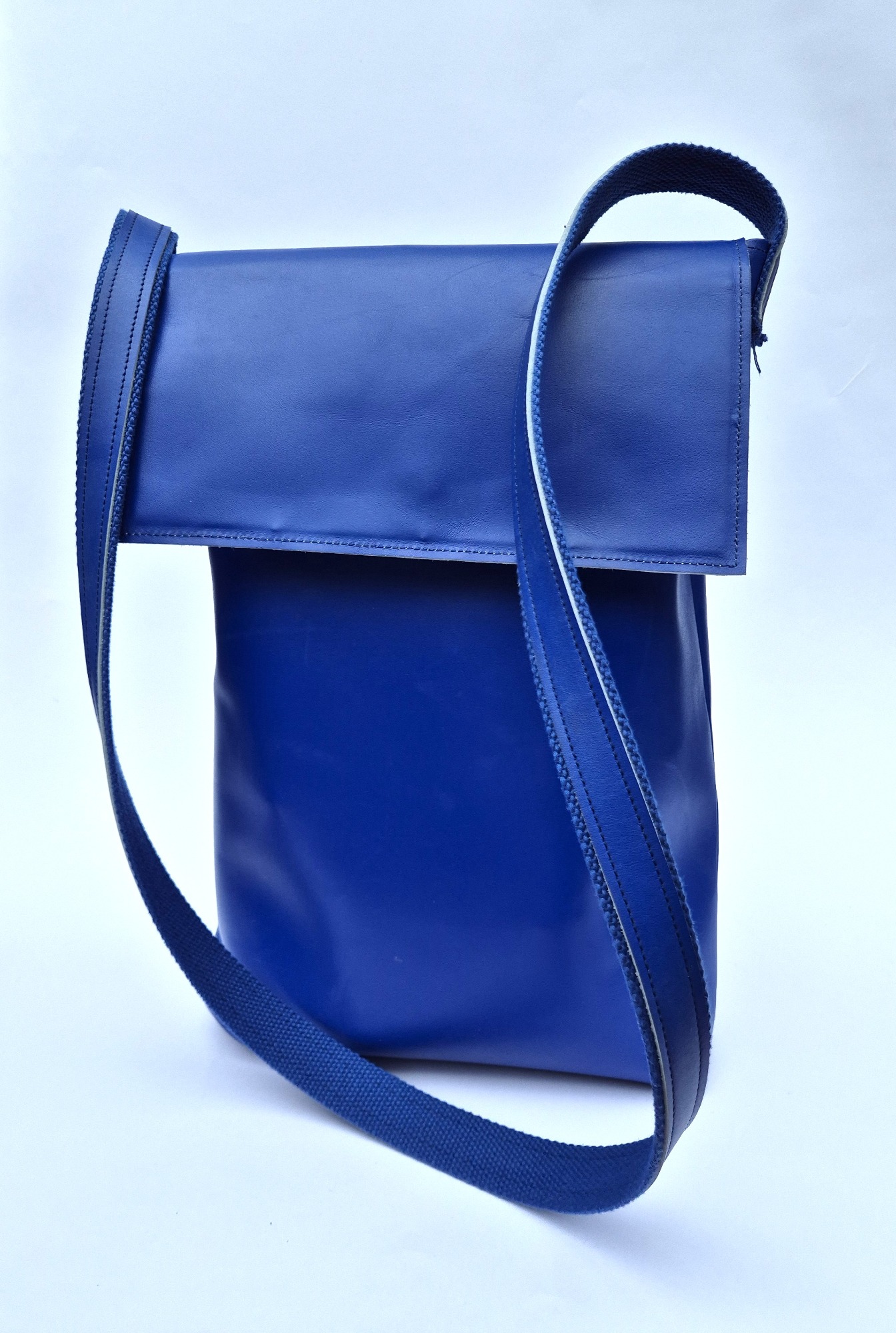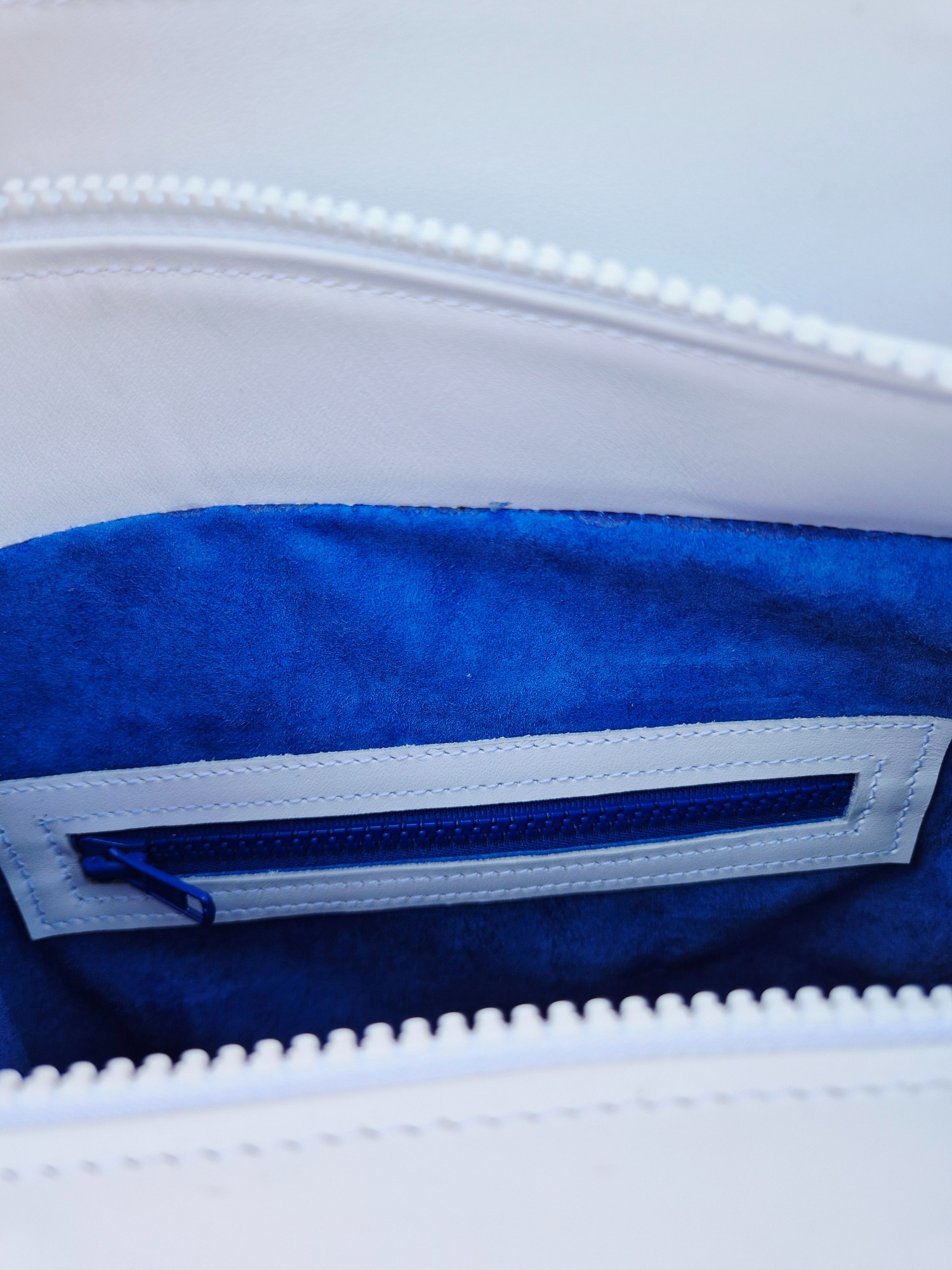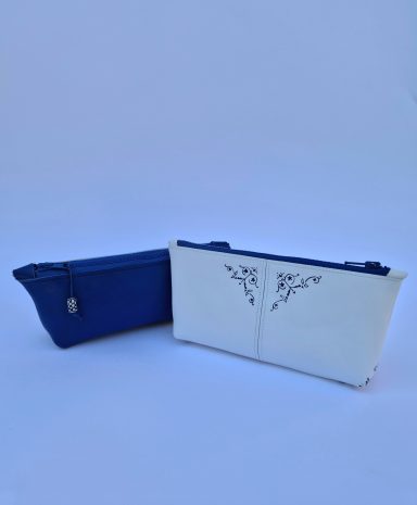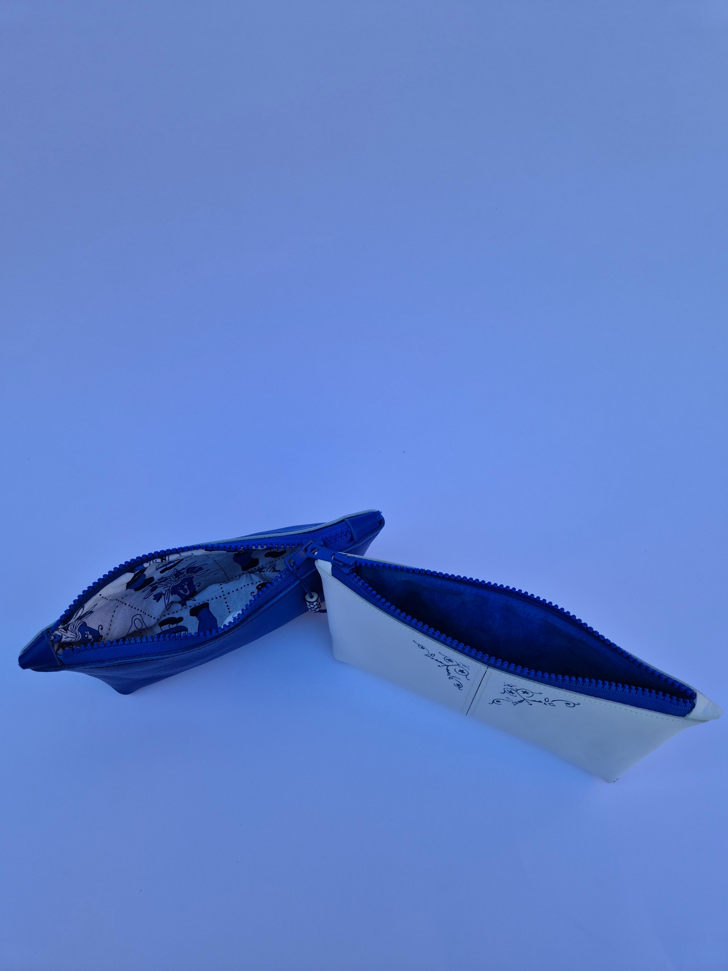 De kenmerkende ontwerpen van het label Croon Delft bestaan uit met de hand beschilderde Delfts Blauwe lederen tegels, die zorgvuldig in de tassen zijn verwerkt als opvallende pronkstukken.